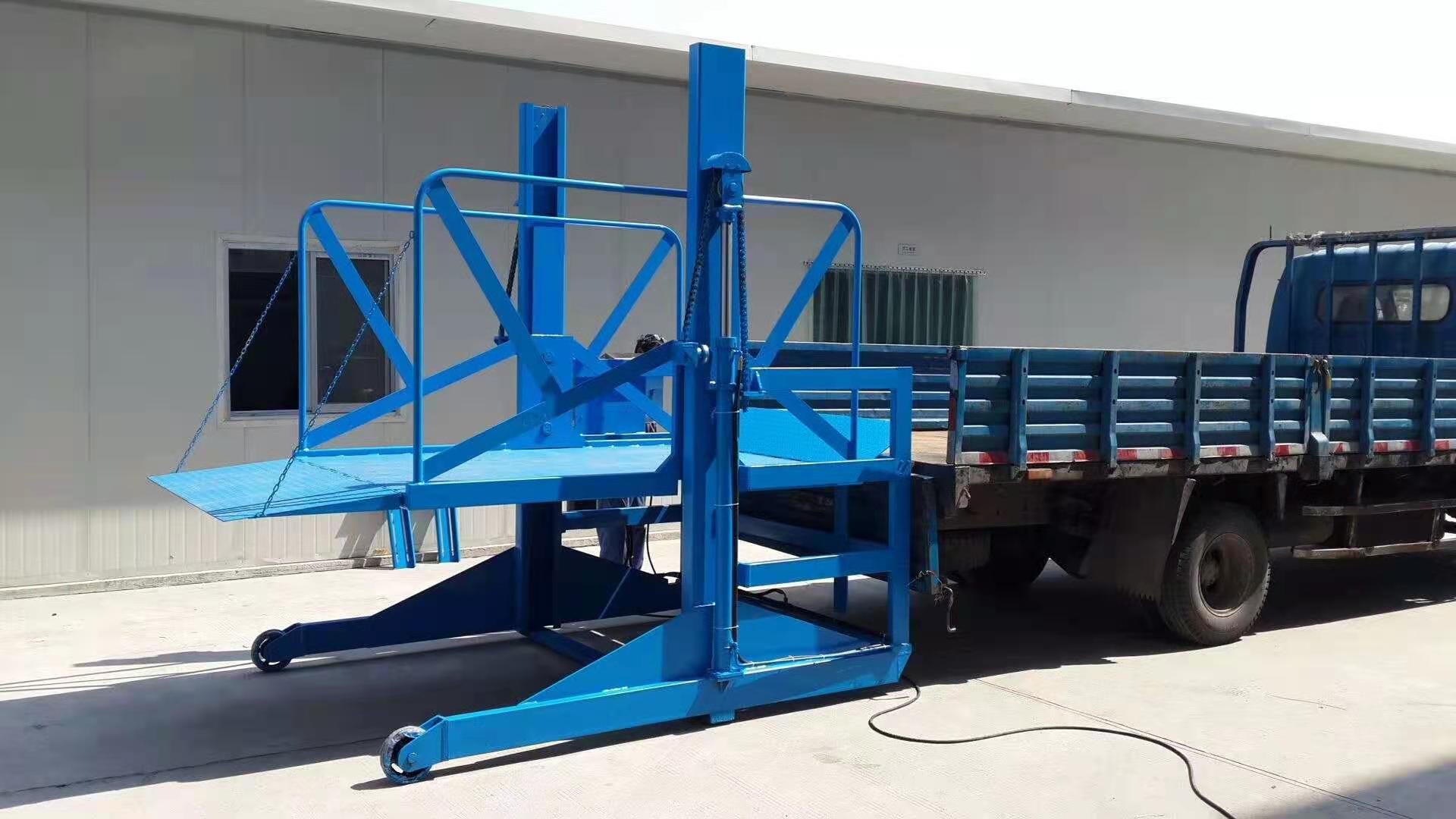移動式裝卸貨平臺用于配合貨車裝卸貨物。設(shè)備上的翻板對接貨車尾部,可以提升2噸的貨物,底部輪子移動行走, 屬于流動式的登車橋,大大利用工廠實際使用空間,提高裝卸貨的效率,減少人工成本。