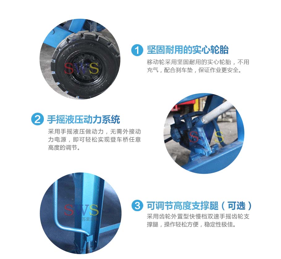 采用人工液壓動(dòng)力,勿須外接動(dòng)力電源即可輕松實(shí)現(xiàn)登車橋的高度調(diào)節(jié)。