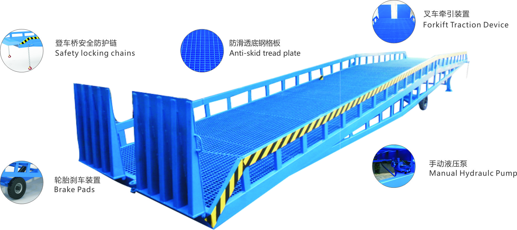 5. 橋體與集裝箱連接處有帶掛鉤的鏈條,使汽車和登車橋緊密連接,保證工作時(shí)的安全可靠性。