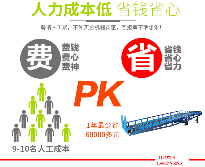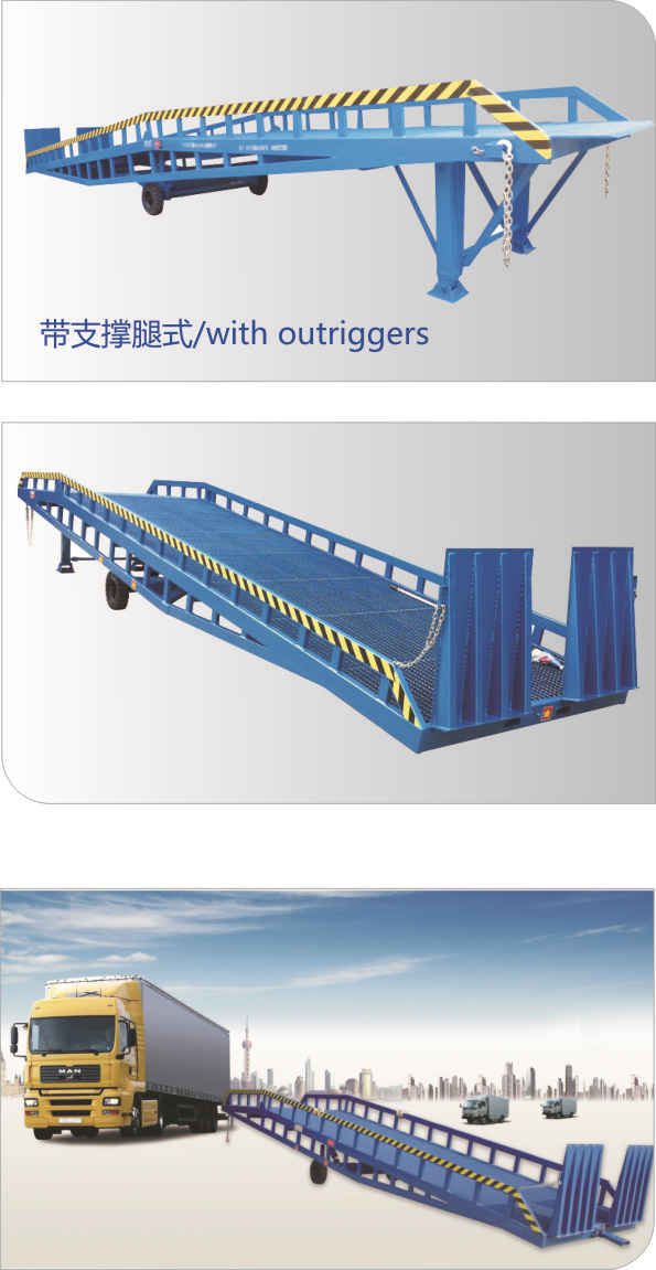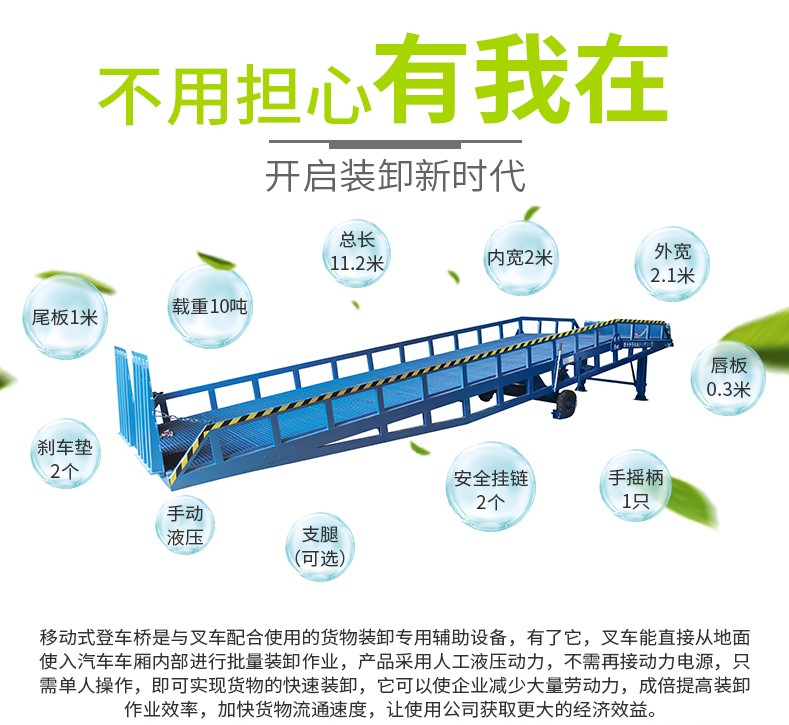 只需單人操作,不需動(dòng)力電源,即可實(shí)現(xiàn)貨物的安全快速裝卸。移動(dòng)式登車橋用于無裝卸設(shè)備的貨臺(tái)及流動(dòng)裝卸場所,是與叉車配合使用的貨物裝卸輔助設(shè)備。可根據(jù)汽車車廂的高低調(diào)節(jié)高度,叉車可以直接通過本設(shè)備駛?cè)胲噹麅?nèi)部進(jìn)行貨物的批量裝裝卸。